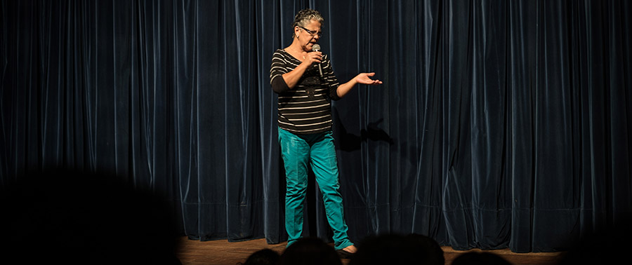 Divida o palco em momentos e ocupe ele com sua informação. Se vai falar algo de maneira cronológica, por exemplo, é interessante que distribua essa informação no palco da sua apresentação. Comece, parado, no canto esquerdo (para o espectador) falando sobre o começo da linha cronológica e de raciocínio. Para cada salto temporal apresentado você anda em direção à direita. Lembrando sempre de estar parado para pontuar o espaço/tempo da história. Ao final do raciocínio você estará no canto direito do palco, dando a sensação de que seu movimento corporal representou o tempo na apresentação.